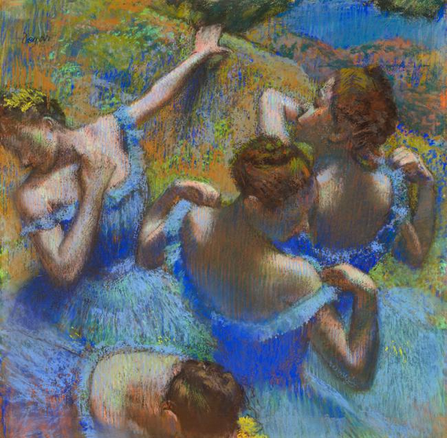 Мир балета стал одной из самых любимых тем Дега, к которой он постоянно возвращался в своем творчестве. Однако, в отличие от многих современников, художника привлекает не красочный праздник театра, а проза закулисной жизни. «Голубые танцовщицы» могут показаться зарисовками одной и той же балерины: вот она завязывает пуант, потом поправляет платье, осматривает свой костюм, держась за край декораций. Соединенные в пределах одного листа, эти обычные движения вдруг превращаются в прекрасный танец; на наших глазах рождается магия театра и магия живописи. Благодаря использованию техники пастели, в этой работе Дега удается добиться удивительного богатства фактуры и цветовых сочетаний. Небольшие мазки-штрихи ложатся в разных направлениях, соединяясь в звучные потоки синих теней или рассыпаясь отблесками света на волосах танцовщиц. Художник Морис Дени, посетивший Москву в 1909 году, увидев эту пастель Дега в домашней галерее коллекционера С.И. Щукина, так отозвался о ней: «В большом салоне – голубой Дега, самый прекрасный, самый звонкий и самый новый».