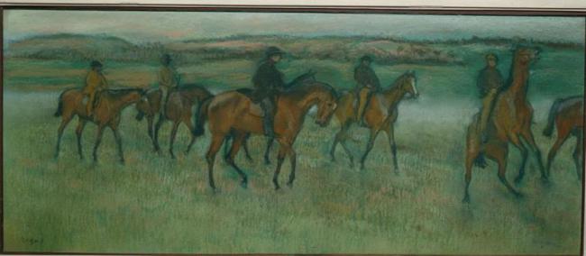На протяжении всего своего творчества Дега неоднократно обращался к изображению наездников и лошадей. Много часов с блокнотом в руках он проводил в Лоншане, излюбленном месте парижских скачек. Многочисленные рисунки с изображением жокеев на лошадях, рук с поводьями, лошадей, сделанные в записных книжках, мастер затем использовал при создании картин. Дега интересовала возможность передачи в рисунках и на холсте движения, зафиксированного в малейших изменениях.