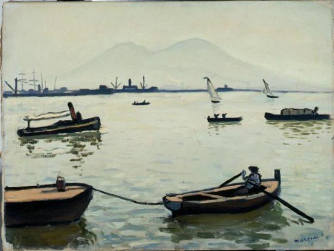 В 1908 году Марке впервые едет в Италию. Он останавливается в Неаполе, где снимает комнату с прекрасным видом на залив с силуэтом Везувия на горизонте. Именно там в 1909 году была написана картина «Везувий». Знаменитый вулкан, изображенный на закате дня, тает на горизонте. На мерцающей глади залива изображены парусники, баржи, лодки. Художник кладет краски крупными отдельными мазками, сквозь которые в некоторых местах просвечивает белый загрунтованный холст, и атмосфера картины наполняется свежим морским воздухом. Кричащей яркости краски Марке предпочитает гармонию и нежность цвета.