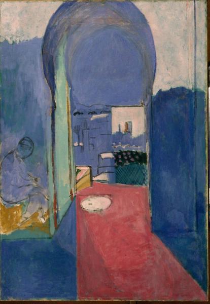 Во «Входе в касбу» синий цвет обозначает глубокую тень, поглотившую первый план картины. Сидящий у входа в касбу араб, которого не сразу замечаешь, растворяется в этом глубоком синем, напоминая призрак, что лишь усиливает атмосферу африканского зноя, сонную пустынность Танжера. В архиве Матисса сохранилась открытка с танжерскими воротами Баб-эль-Ааса, с которой он, возможно, и писал данный мотив. Но художника мало интересуют документальные подробности, он отказывается от них во имя солирующей роли синего цвета, превратившего все части триптиха в своеобразную сюиту.