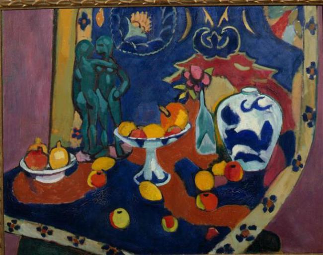 В натюрморте «Фрукты и бронза» Матисс рационально упрощает художественные средства для усиления выразительности и декоративной целостности. Художник полностью отказывается от моделировки объемов, уничтожая тем самым трехмерное пространство, и превращает натюрморт в сверкающую цветом драгоценную плоскость. Цветистое узорочье ковра заполняет почти все пространство картины. Изображенные на фоне ковра предметы — вазы, фрукты, скульптура Матисса «Две негритянки», исполненная им в 1908 году, — лишившись объема, включаются в общий ритм композиции. При помощи чистых цветов, напоминающих своим сверканием средневековую эмаль, художник передает сильное душевное переживание, которое вызвал в нем изображенный мотив. Линия, очерчивая силуэты предметов, несет в себе ритмическое и орнаментальное начало. Сделав цвет и линию главными элементами своего художественного языка, живописец использует их не только для придания своему полотну равномерной изобразительной напряженности, но и для решения пространственных соотношений в картине. Не разрушая плоскости картины, Матисс заставляет зрителя воспринимать некоторые предметы как более близкие благодаря тому, что окрашивает их в светлые и теплые тона, предметы же, окрашенные в темные и холодные оттенки, кажутся более далекими, а намечающие формы вещей линии выявляют пространственные связи между ними. «Цвет и линия — это силы, и в игре этих сил, в равновесии их скрыта тайна творения», — писал Матисс.