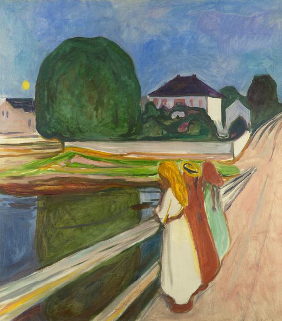 Осгардстран – небольшой городок на берегу фьорда недалеко от Осло, где находился дом Мунка, в который художник приезжал каждое лето. Первое полотно «Девушки на мосту» на один из самых излюбленных и самых лирических сюжетов в творчестве художника было создано в 1900–1901 годах. Картина из собрания ГМИИ – авторский вариант, чрезвычайно близкий к первоначальному, поскольку был написан вскоре после него специально для парижского Салона Независимых 1903 года, где картина была приобретена М.И. Морозовым. В настоящее время известно семь авторских версий, которые находятся в различных музея и частных коллекциях.