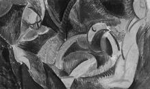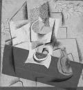 Композиция с разрезанной грушей и гроздью винограда 67,6х52,2; картон, коллаж на коричневой бумаге, гуашь, клеевая краска, опилки пихты | ![]() |