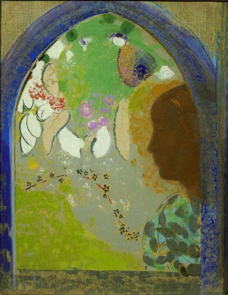 Пастель «Профиль женщины в окне» (1903—1908) напоминает средневековый витраж. Художник оставляет зрителю право вольной трактовки образов, что сродни задачам, которые ставили перед собой литераторы-символисты. В своем произведении Редон изображает цветы, которые как символ красоты были излюбленным мотивом символистов: в них изначально заложено невыразимое и тайное. «Кругом символика цветов//Забав унылых ненюфары. Влюбленных пар немые чары//Мечты лиан, холодность мхов», — этими строками одного из стихотворений Метерлинка можно по праву охарактеризовать многие произведения Редона. Цветы выступают у художника в качестве некоего понятия, как сложившийся образ-символ, как признак поэтического созерцания мастера. В соединении четкого контура и размытого цвета художник создает ощущение точного и неясного одновременно. Женский профиль, похожий на маску, дается как бы погруженным в себя, в состояние нирваны, унося зрителя в утонченную сферу грез и сновидений. Любимая символистами тема молчания, сна придает работе Редона двойное бытие, являясь своеобразным средством интуитивного познания мира в его философском понимании, способом постижения сокровенных тайн.