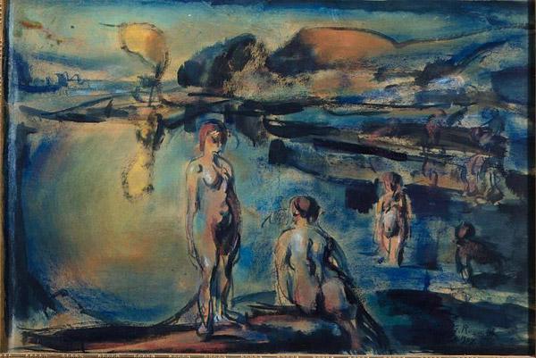 В своей картине «Купание в озере», обращаясь к традиционному мотиву изображения обнаженной натуры в природном окружении, живописец наполняет атмосферу произведения внутренним беспокойством, огрубляя детали и «сгущая краски». В творчестве Руо начинают звучать трагические ноты, не свойственные фовистам. Жертвуя правдоподобием, художник достигает напряженной интонации в своих произведениях, что предвещает будущие эксперименты экспрессионизма.