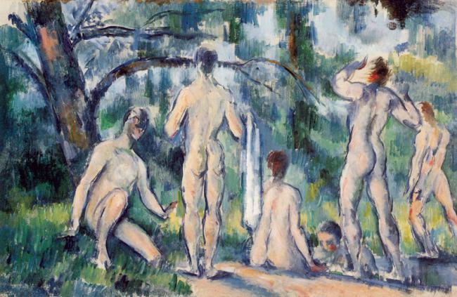 В середине 1890-х годов Сезанн задумал создать монументальное полотно с обнаженными в пейзаже – некий синтезированнный образ вселенной. В серии этюдов, к которым относится и московская работа, художник пытался достичь гармонии в изображении обнаженных фигур и пейзажа: тела, деревья, очертания гор вдали составляют единый прочный каркас – опору мироздания. Торсы купальщиков вытянуты и очерчены гибкими прерывистыми линиями, позволяющими фигурам раствориться в окружающем пейзаже. Вместе с тем в этом полотне уже намечены «архитектурные» структурирующие функции природных мотивов, окончательно нашедшие воплощение в знаменитых «Больших купальщиках» (1905–1906) из коллекции Барнса в Мерионе (США).