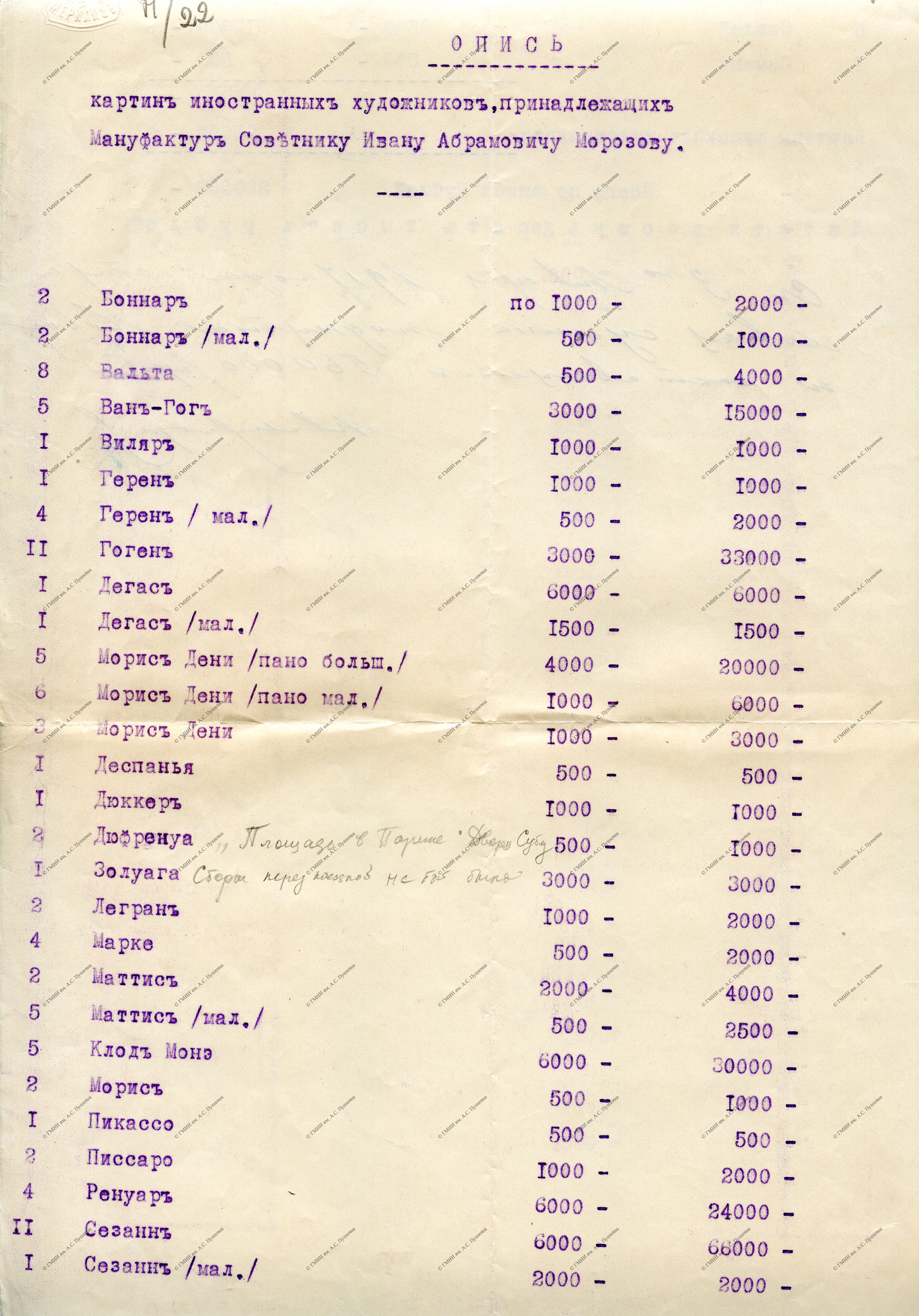 Опасаясь за судьбу коллекции, в тревожные военные и предреволюционные 1914-1916 годы, И.А.Морозов составил список с оценкой страховочной стоимости своего собрания.