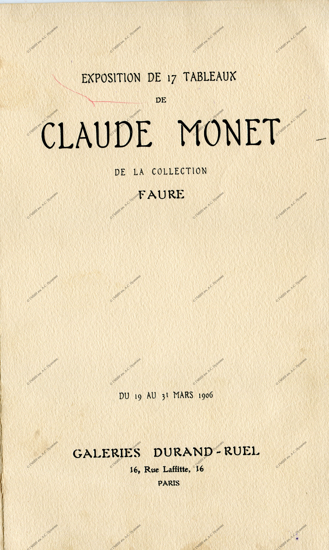 3. Каталог"Выставки 17 картин Клода Монэ. De la collection FAURE Выставленных в галерее Дюран-Рюэля (Париж) С 19 по 31 марта 1906 Рукой Морозова отмечены и проставлены цены :