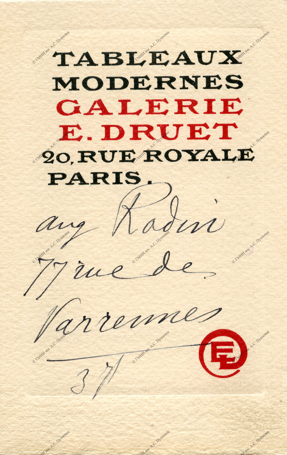 5. Визитная карточка" Galerie DRUET с адресом А.Родена, записанного рукой И.А.Морозова 1908-1909