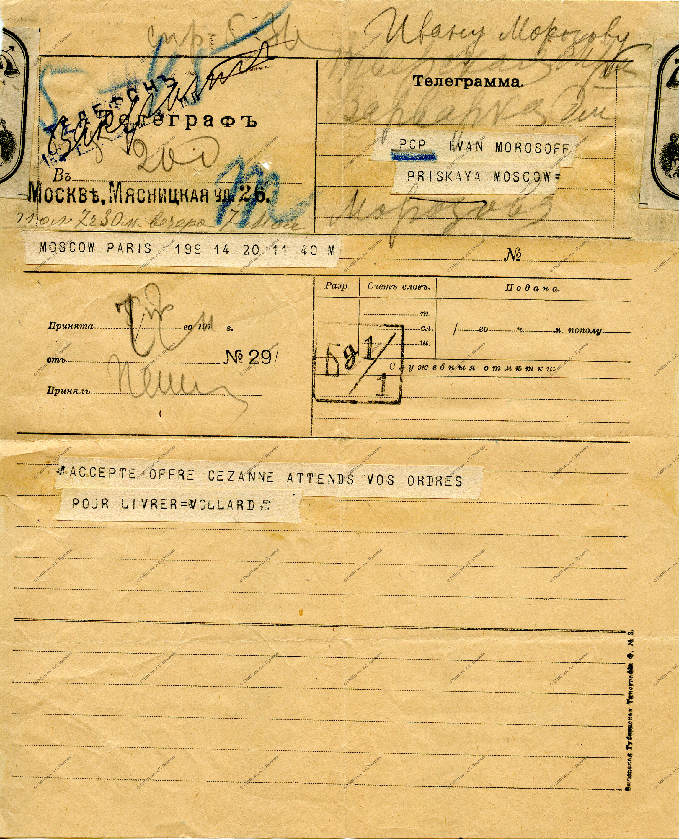 6. Воллар А. (VOLLARD Ambroise) Морозову И.А. Телеграмма. Париж