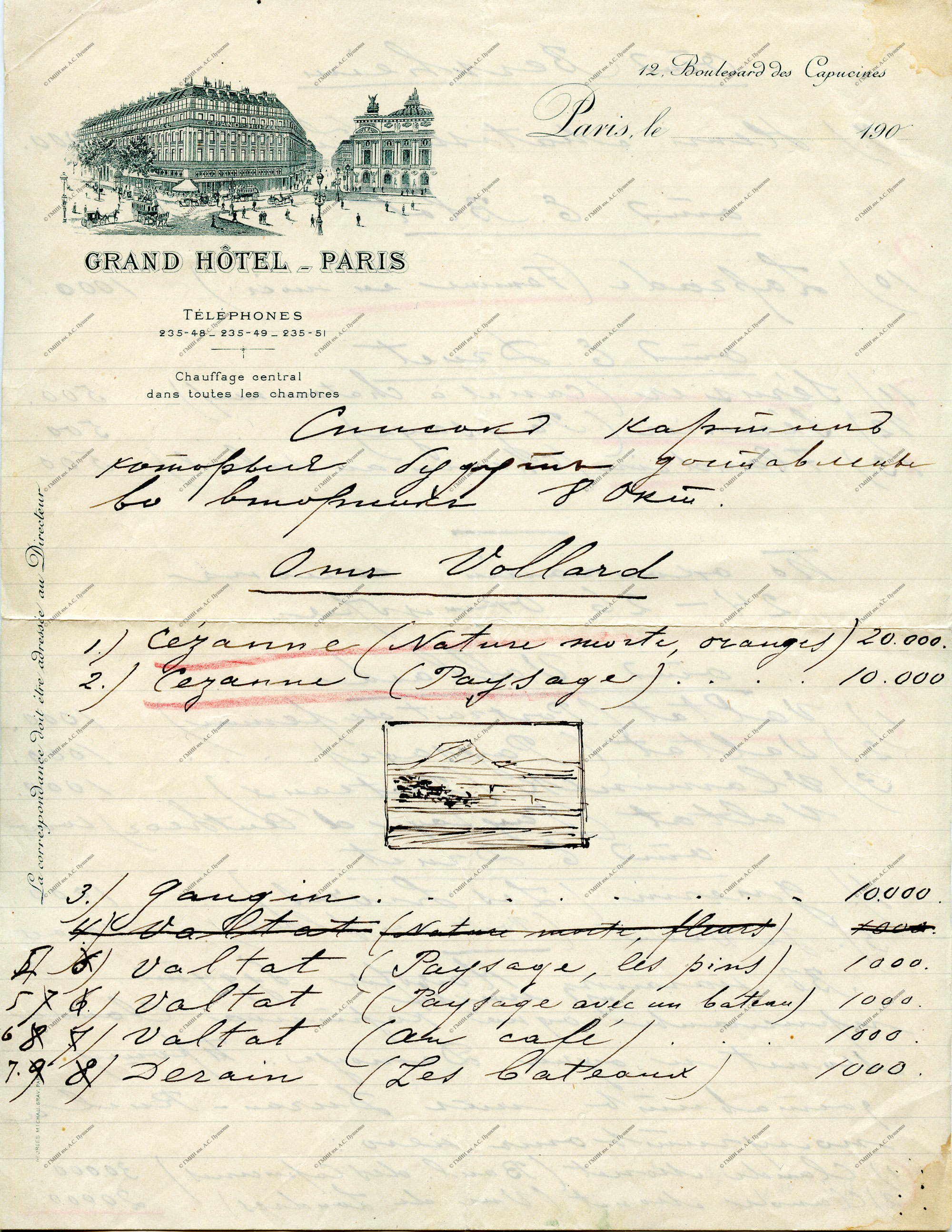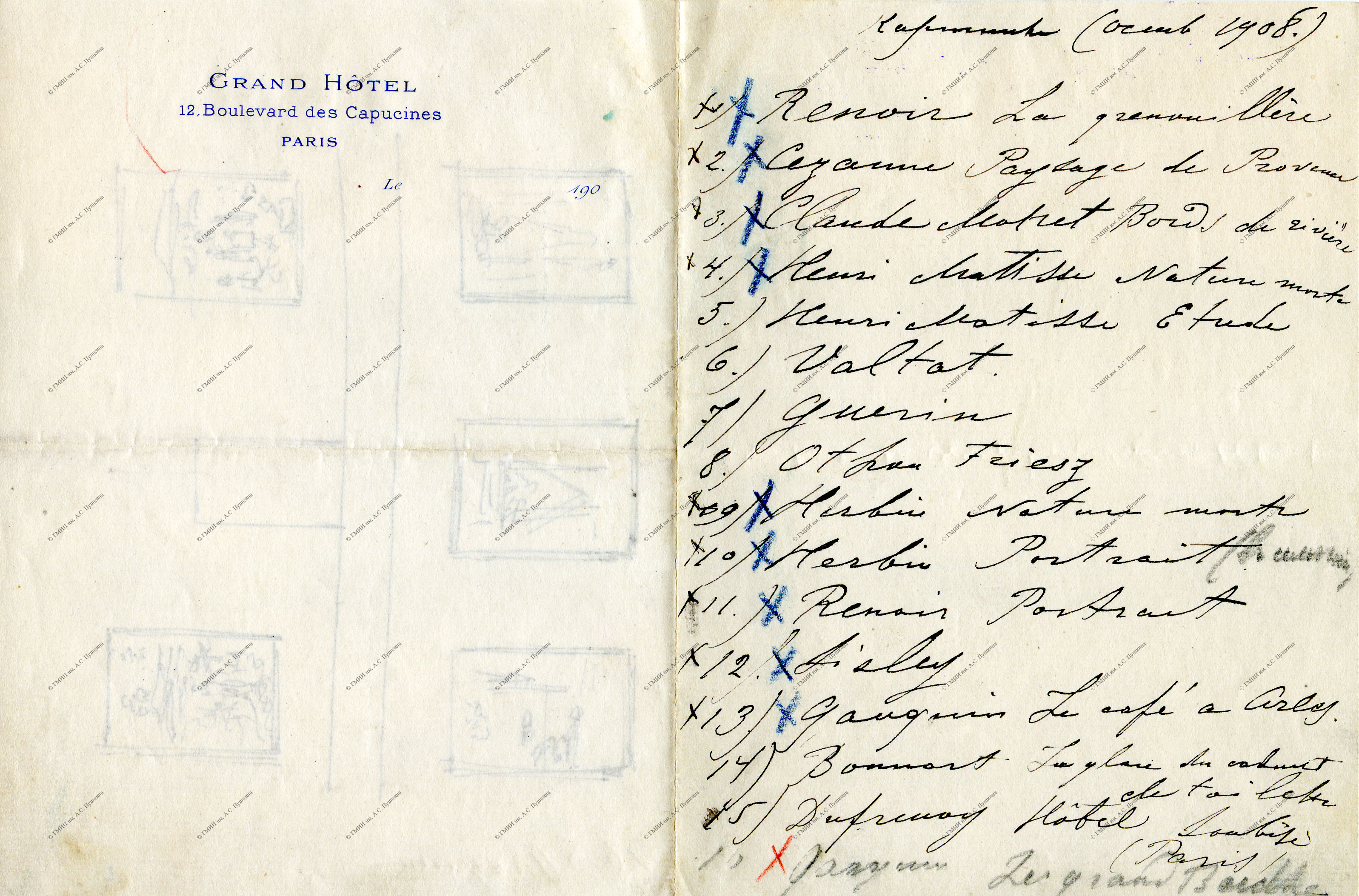 1. Составленый И.А.Морозовым список картин приобретенных у Воллара, Бернхейма, Дрюэ, Бло Октябрь б/г (после1907) Написан на почтовой бумаге Гранд Отеля (Париж)