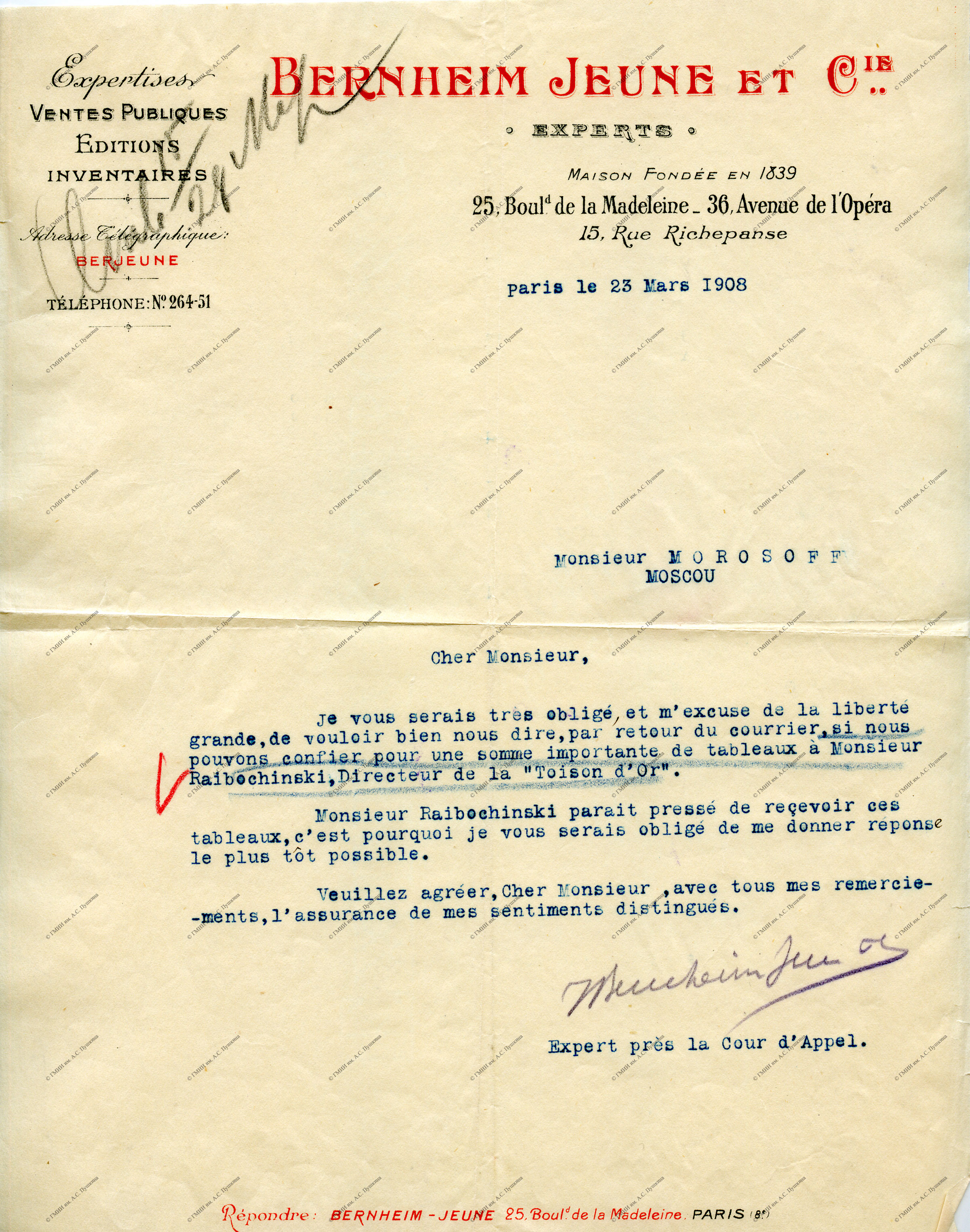 10. Бернхейм (BERNHEIM Jeune) Морозову И.А. Письмо. Париж