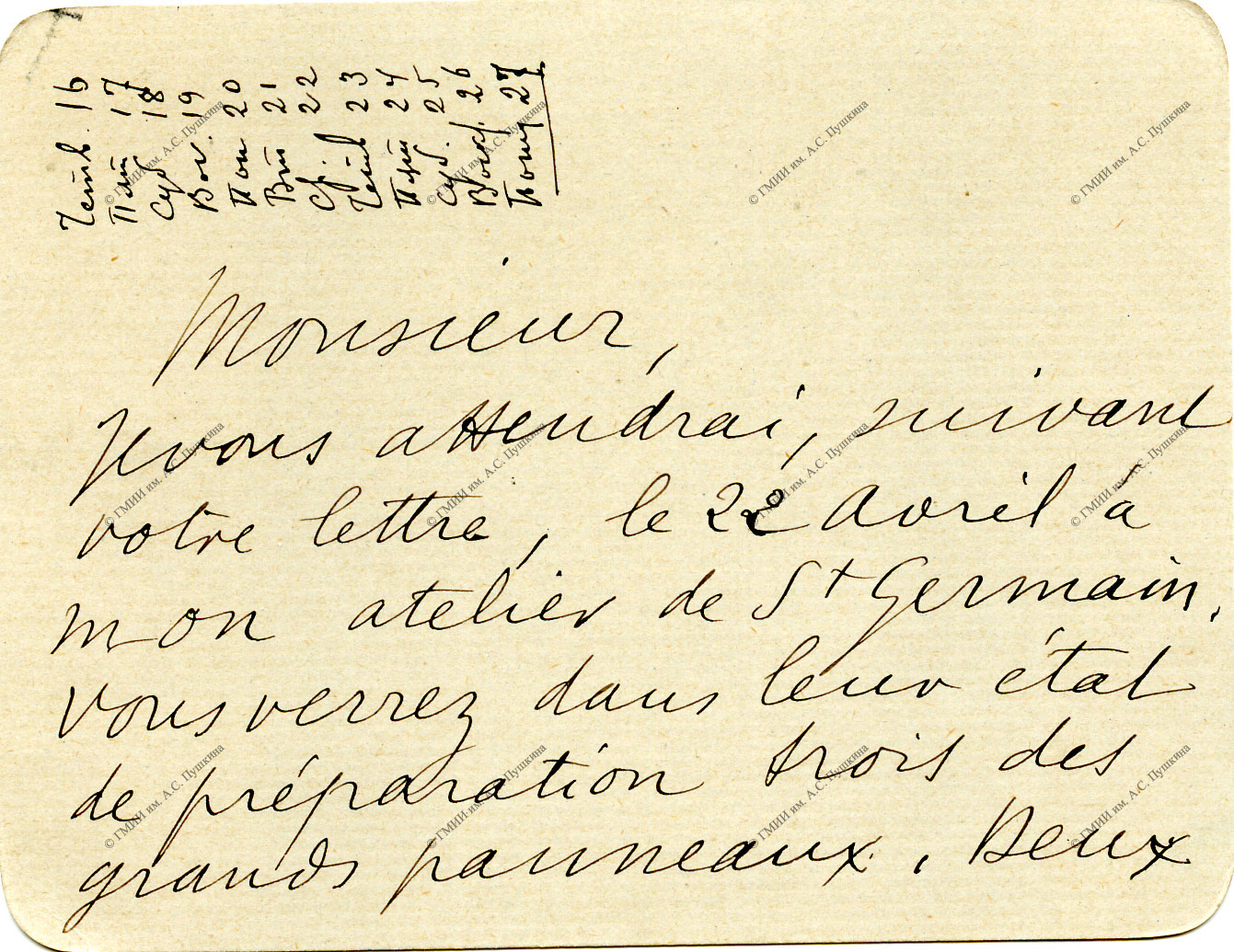 Из письма М.Дени И.А.Морозову [1908 г] «Милостливый Государь, Я буду Вас ожидать, согласно Вашему письму в С.Жермене. Вы увидите три больших панно в процессе работы. Два остальных только эскизно набросаны».
